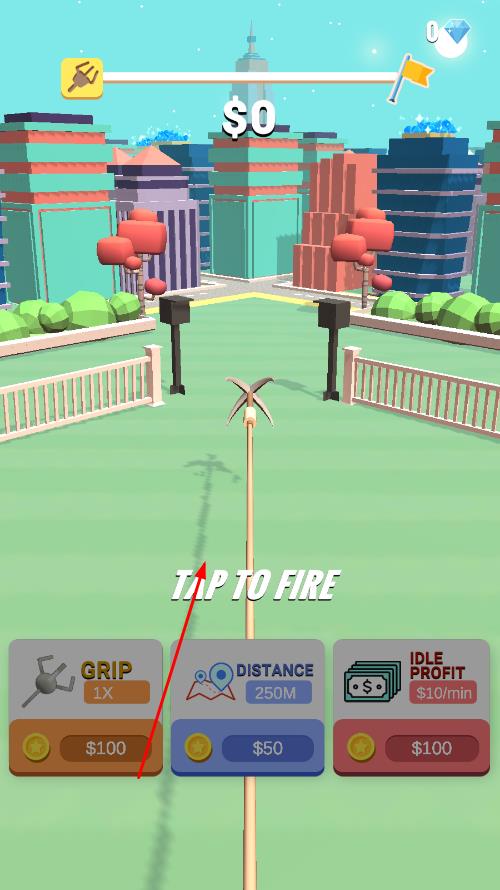 1、進(jìn)入游戲,在初始界面中,可看到鉤子,點(diǎn)擊TAP TO FIRE,發(fā)射鉤子。