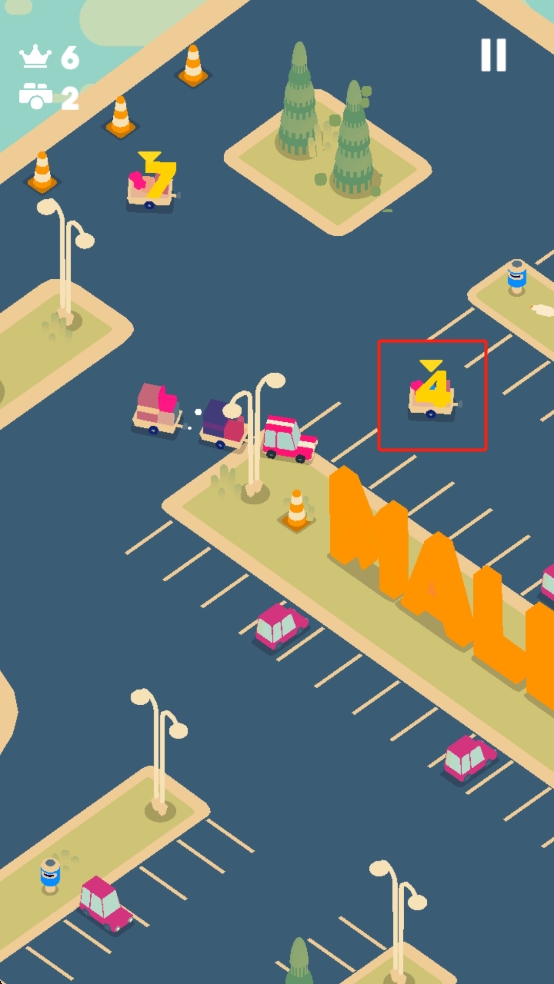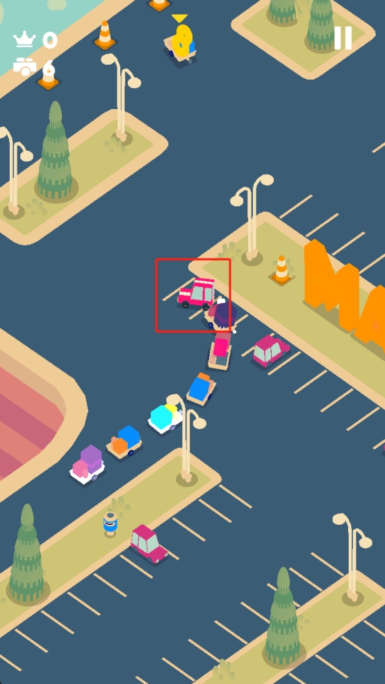 1、在道路場(chǎng)景中我們操控紅色小車,需精準(zhǔn)連接同色車輛形成車隊(duì),行駛時(shí)避開其他顏色車輛與路障。