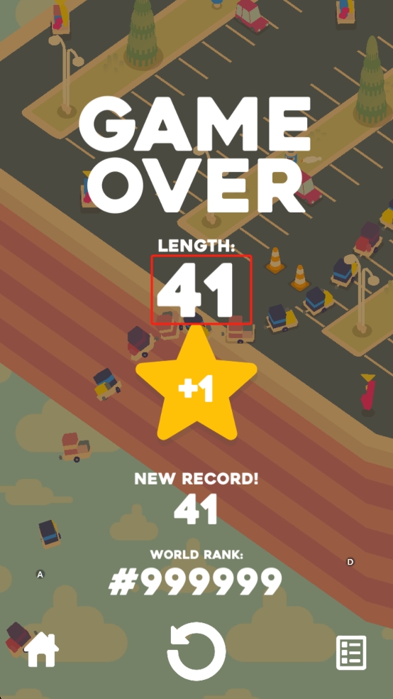 3、游戲結(jié)束后,界面顯示GAME OVER,本次行駛長(zhǎng)度為41,獲得1星獎(jiǎng)勵(lì),新紀(jì)錄同步更新,可點(diǎn)擊重新開始按鈕繼續(xù)挑戰(zhàn)。
