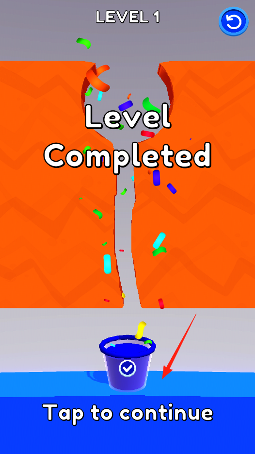 2、水流成功流入水桶,關(guān)卡完成,點(diǎn)擊Tap to continue進(jìn)入下一關(guān)卡,可查看獎(jiǎng)勵(lì)總結(jié)本關(guān)導(dǎo)流經(jīng)驗(yàn),體驗(yàn)關(guān)卡推進(jìn)機(jī)制。