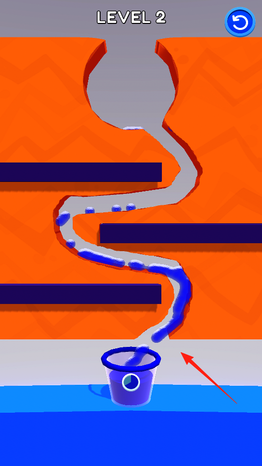 3、進(jìn)入第二關(guān),墻體有彎曲通道和障礙,需畫線規(guī)劃水流避開障礙,讓水沿通道流入水桶考驗(yàn)畫線精準(zhǔn)度,體驗(yàn)復(fù)雜導(dǎo)流玩法。