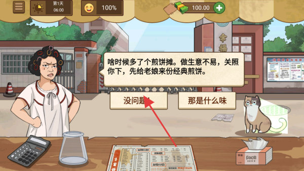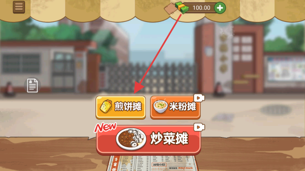 1、進(jìn)入游戲界面,根據(jù)紅色箭頭所指的方向,選擇煎餅攤選項(xiàng),開始進(jìn)行煎餅制作任務(wù),推進(jìn)游戲的劇情發(fā)展。