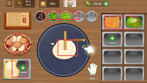3、利用紅色方框內(nèi)的虛擬按鈕選擇食材,制作煎餅,完成顧客的訂單,獲取游戲得分和獎(jiǎng)勵(lì),積累游戲資源,提升角色的能力。