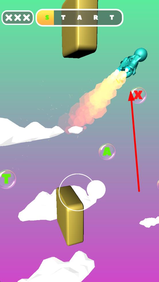 3、繼續(xù)飛行,留意箭頭指向的字母氣泡,優(yōu)先撞擊有益字母,避開X等不利氣泡,同時(shí)注意躲避金色方塊障礙,保持飛行安全。