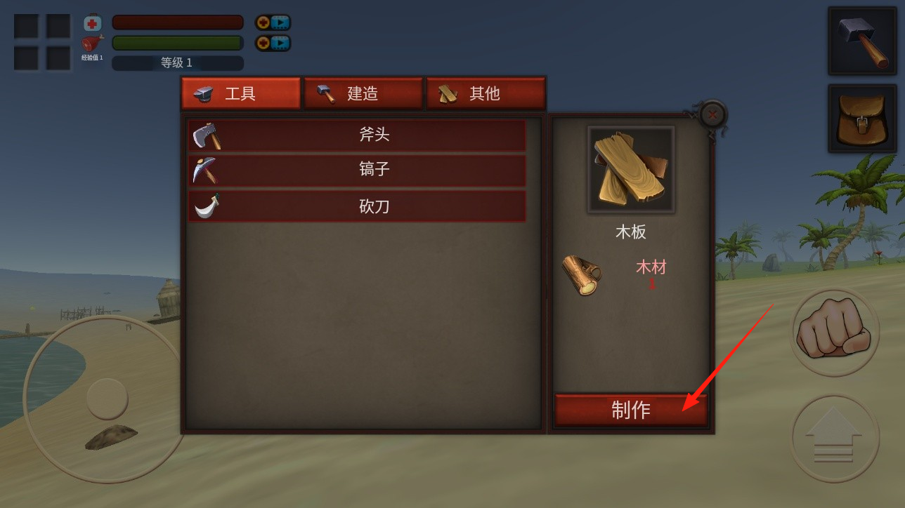 2、打開(kāi)制作界面查看工具列表,選擇木板和木材,點(diǎn)擊制作,打造對(duì)應(yīng)工具,用于后續(xù)采集建造,體驗(yàn)生存建造機(jī)制。
