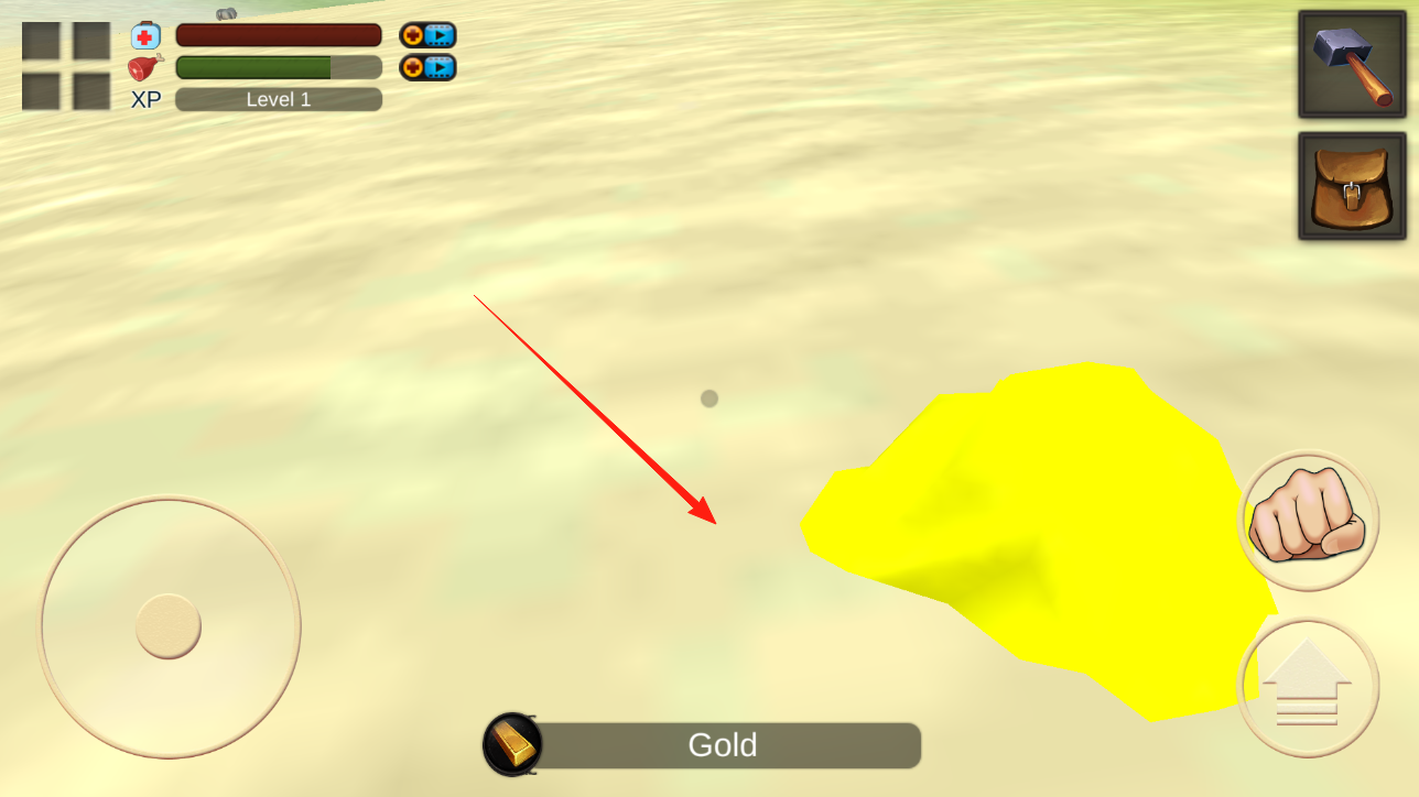 3、在沙灘場(chǎng)景,操控角色靠近黃色區(qū)域,使用拳頭或工具互動(dòng)挖掘獲取黃金,積累資源,助力生存發(fā)展,體驗(yàn)資源采集玩法。