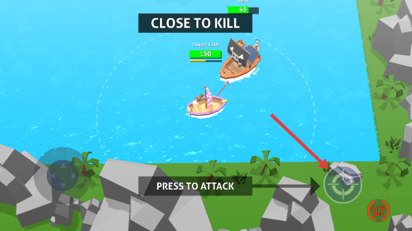 3、當(dāng)靠近敵方船只有CLOSE TO KILL提示時(shí),點(diǎn)擊右側(cè)PRESS TO ATTACK按鈕,立即發(fā)起進(jìn)攻打擊對手。