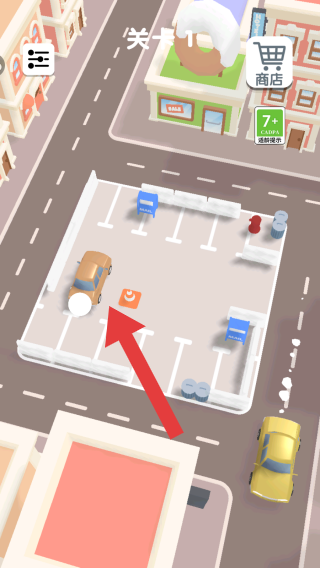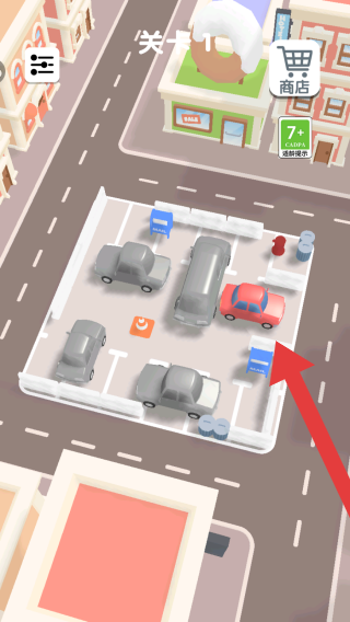 2、畫(huà)面中處于停車(chē)場(chǎng)的區(qū)域,停放著多輛不同顏色的汽車(chē),需要根據(jù)入口的提示將能開(kāi)出去的車(chē)進(jìn)行移動(dòng)。