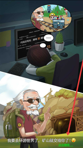 1、接收礦山后,點(diǎn)擊畫面下方中的文字點(diǎn)擊繼續(xù),開啟礦山經(jīng)營之旅,承接環(huán)游世界老人托付的礦山。