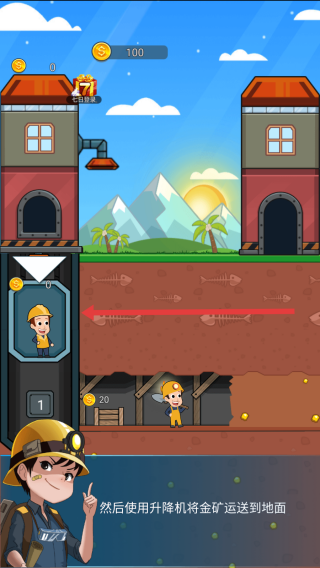 3、礦工挖到金礦后,可以點(diǎn)擊使用升降機(jī)將金礦運(yùn)送至地面,完成采礦-運(yùn)輸流程積累財(cái)富。