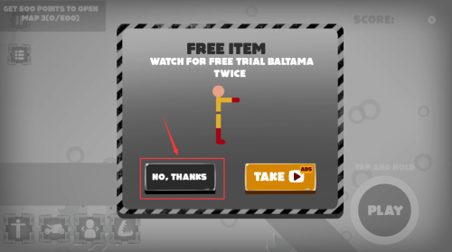 4、點(diǎn)擊紅框NO, THANKS按鈕,拒絕觀看廣告繼續(xù)游戲。