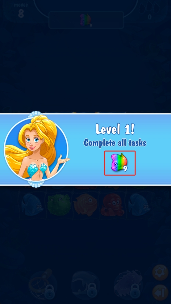 1、進(jìn)入Level1,目標(biāo)是收集9條彩虹魚,觀察魚群布局,規(guī)劃消除路徑,通過交換相鄰魚達(dá)成同色3個及以上消除。