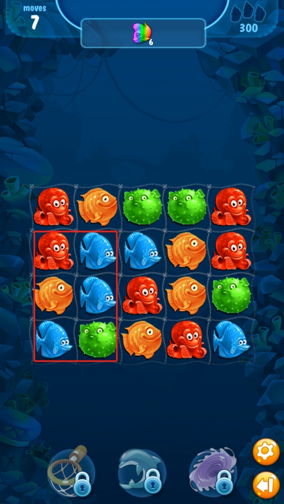 3、道具功能多樣:炸彈可消除一片區(qū)域,彩虹魚能替換任意生物,不同道具針對不同障礙設(shè)計(jì),合理使用能快速突破難關(guān),提升通關(guān)效率。