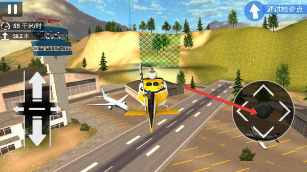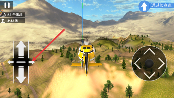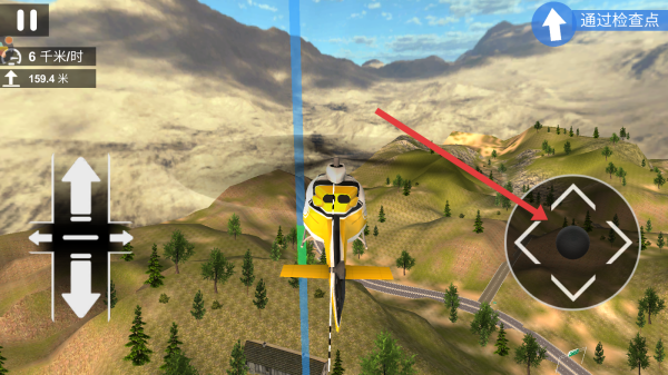 1、完成開飛機的教程后,進入場景用左側(cè)十字鍵控制直升機升降、轉(zhuǎn)向,右側(cè)圓盤調(diào)整機身角度,保持飛行平穩(wěn)。