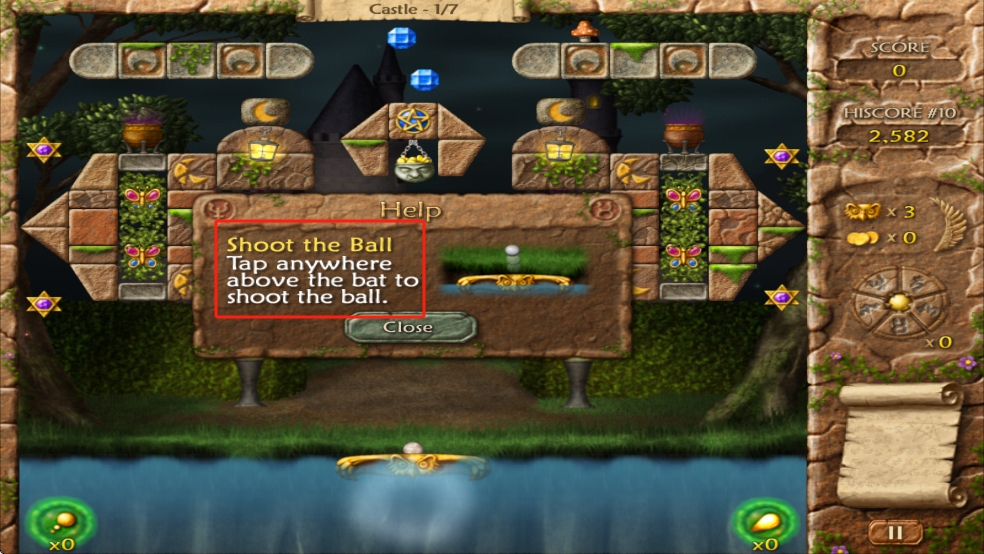 1、進(jìn)入作品后,點(diǎn)擊左側(cè)魔法書查看彈板操作指南,然后點(diǎn)擊球棒上方區(qū)域發(fā)射球,擊碎關(guān)卡內(nèi)石塊、收集寶石。