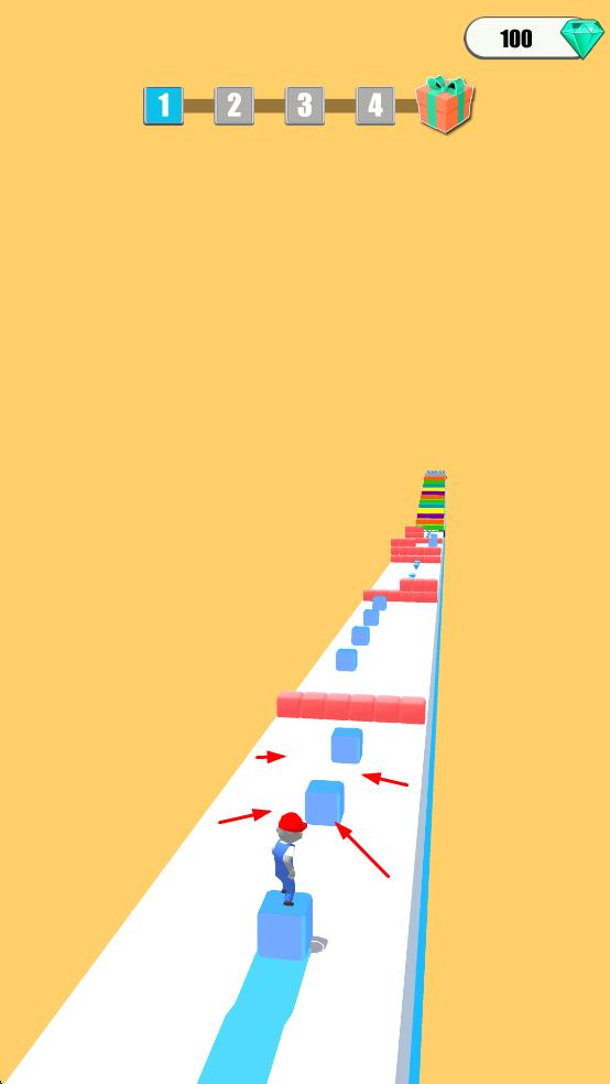 1、堆疊方塊跨越障礙:玩家控制小人在跑道前進,通過在腳上堆疊方塊的方式越過一個個障礙,方塊堆疊的高度與穩(wěn)定性直接影響能否順利通過,需精準(zhǔn)把控堆疊時機。