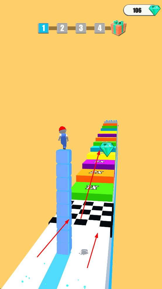 3、留意上方顯示的關(guān)卡進度、鉆石數(shù)量等信息,努力收集更多藍色方塊,堆疊更高的柱子,最終到達賽道終點。