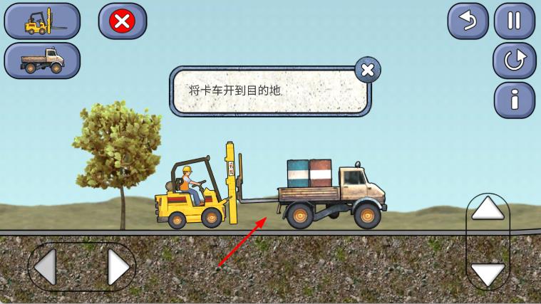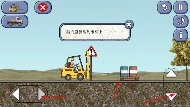 2、通過屏幕左下角的方向按鈕控制工程車移動,屏幕右側(cè)的上下箭頭按鈕控制工程車的操作,將工程車移動到貨物旁邊,操作工程車將貨物裝載到卡車上。