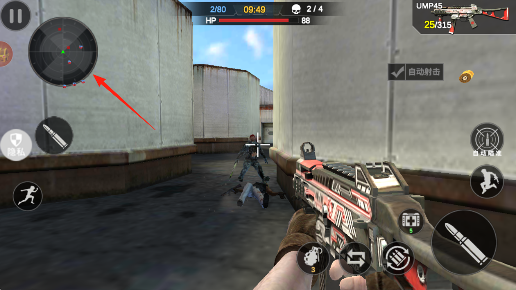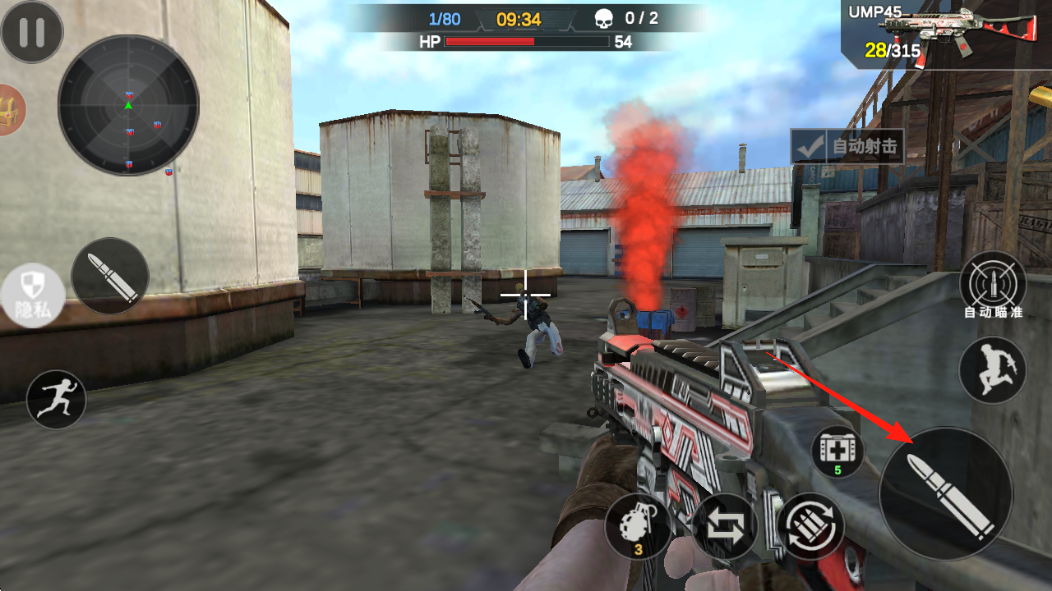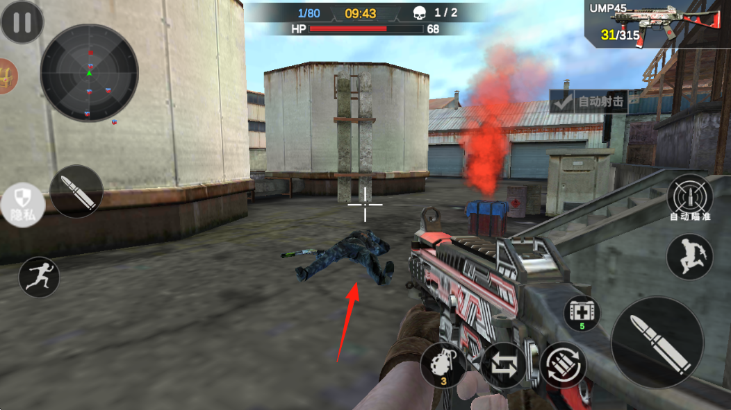 3、注意小地圖左上角紅點(diǎn),標(biāo)記敵人位置,利用掩體油罐、建筑繞后,完成1/80→2/80關(guān)卡,淘汰指定數(shù)量敵人。