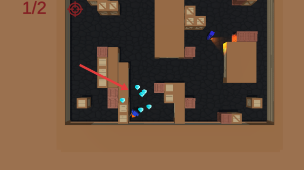 2、Level1場(chǎng)景中沿箭頭移動(dòng)角色,穿梭建筑間收集藍(lán)色鉆石,推進(jìn)1/2到2/2階段進(jìn)度。