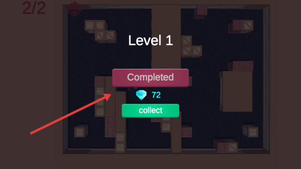 3、鉆石收集完畢界面顯示Level1Completed,點(diǎn)擊綠色collect領(lǐng)取72鉆石獎(jiǎng)勵(lì)并解鎖新關(guān)卡。