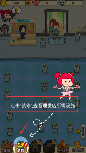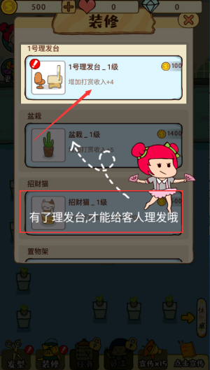 2、點擊紅框裝修按鈕,查看理發(fā)店設(shè)施升級需求。