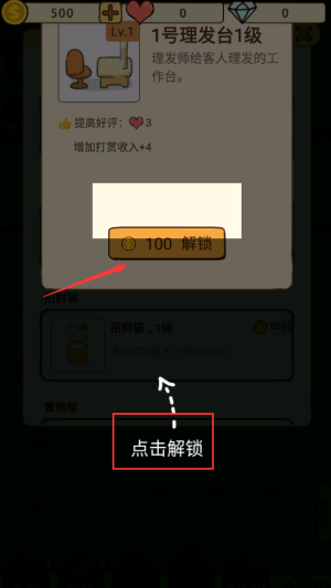 4、點擊紅框解鎖按鈕,支付100金幣啟用1號理發(fā)臺。