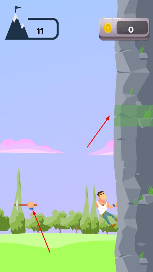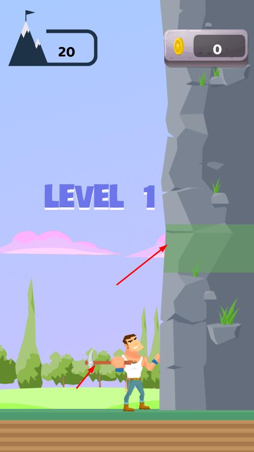 1、進(jìn)入界面,點(diǎn)擊進(jìn)入關(guān)卡1,角色站在山腳下,手持登山鎬,點(diǎn)擊屏幕,控制角色利用登山鎬向上攀爬。