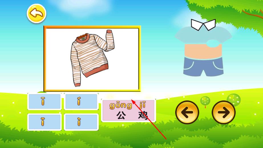 1、進入游戲,在關卡選擇界面,點擊關卡1,在衣物認知與拼音關卡中,屏幕會出現(xiàn)衣物簡筆畫,根據(jù)衣物對應的拼音,點擊正確拼音選項完成學習答題。