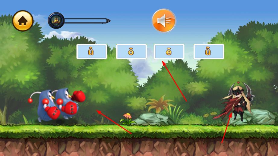 2、在對戰(zhàn)場景拼音關卡里,會呈現(xiàn)角色與小動物對戰(zhàn)畫面,屏幕上方出現(xiàn)拼音選項,選擇正確拼音幫助角色攻擊或完成任務,推進關卡。
