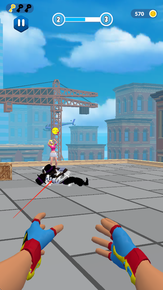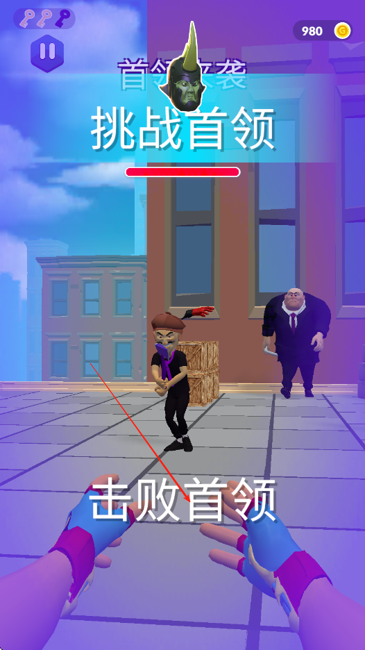 1、點擊屏幕發(fā)射蛛絲,將蛛絲彈射到敵人身上,再將蛛絲的另一頭彈射到另一名敵人身上,讓兩個敵人撞擊在一起。