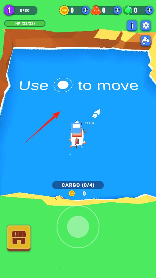 1、依據(jù)提示滑動(dòng)虛擬搖桿,操控小船在水面移動(dòng),探索水域?qū)ふ音~類,為捕魚做準(zhǔn)備,體驗(yàn)移動(dòng)操控機(jī)制。