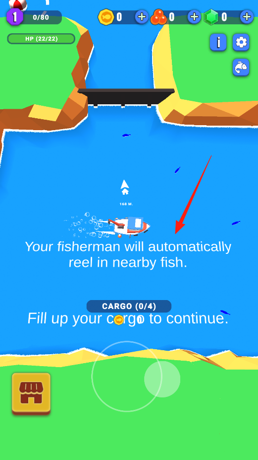2、駕駛小船靠近魚群,漁民自動(dòng)收線捕魚,積累貨物,填滿cargo后推進(jìn)流程,體驗(yàn)自動(dòng)捕魚玩法。