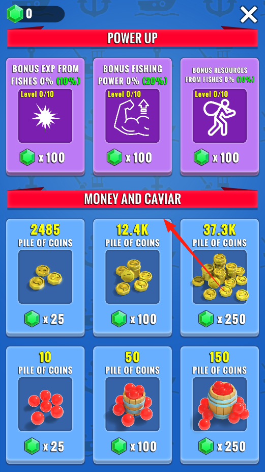 3、進(jìn)入升級(jí)界面選擇金幣堆或能力提升項(xiàng),消耗綠寶石兌換,強(qiáng)化捕魚收益或能力,進(jìn)一步享受游戲,體驗(yàn)資源升級(jí)機(jī)制。