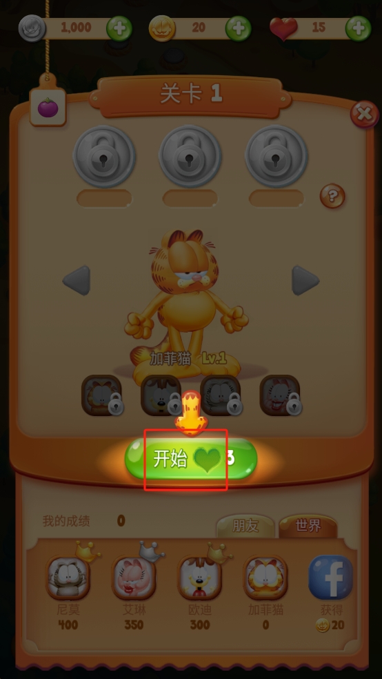 1、在關(guān)卡選擇界面,點(diǎn)擊綠色的開始按鈕,消耗3顆愛心,進(jìn)入關(guān)卡1,使用加菲貓角色開始游戲。
