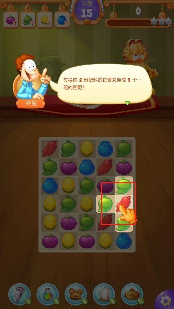 2、進(jìn)入消除界面,按喬恩提示,交換指定綠色蔬菜與紅色香腸位置,湊齊3個同組配料消除,完成任務(wù)。