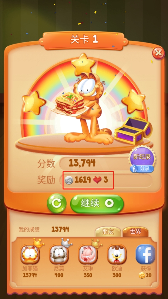 3、關(guān)卡通關(guān)后,屏幕會飄出食物香氣特效,加菲貓會舉著完成的菜品展示,界面上還會顯示本局的評分與獎勵。