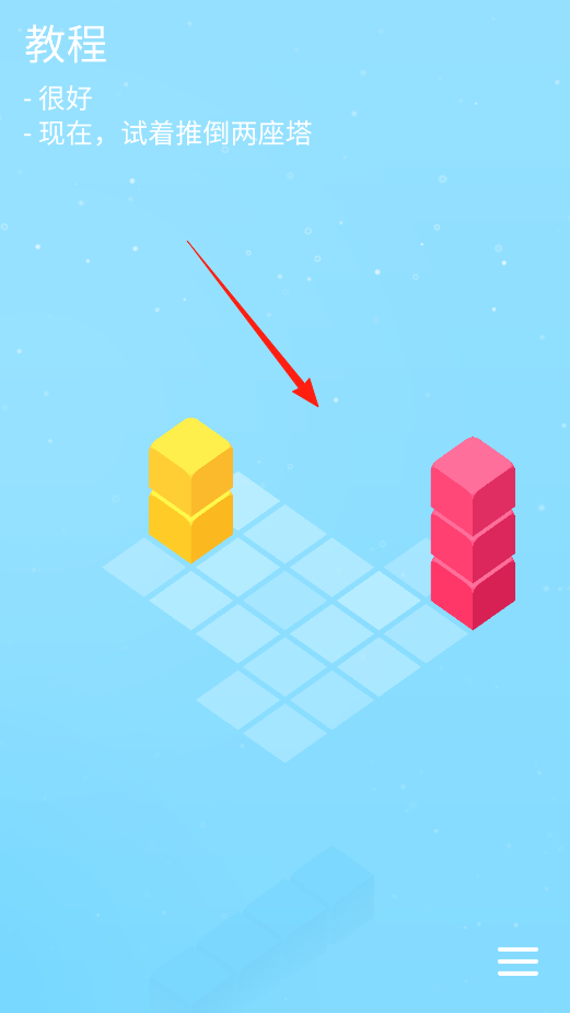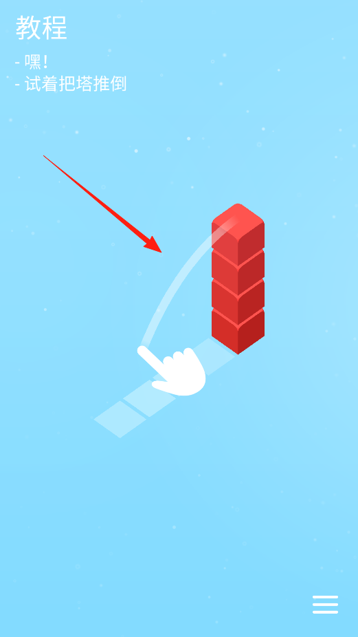 1、跟隨教程指引,用手指滑動,向紅色塔塊施加推力,讓它傾倒,熟悉操作方式開啟推塔挑戰(zhàn),體驗基礎(chǔ)推塔機(jī)制。
