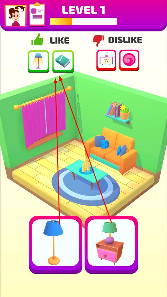 1、在LEVEL1關(guān)卡中,根據(jù)上方顯示的喜歡和不喜歡的物品圖標(biāo),選擇合適的家具和裝飾物品布置房間。