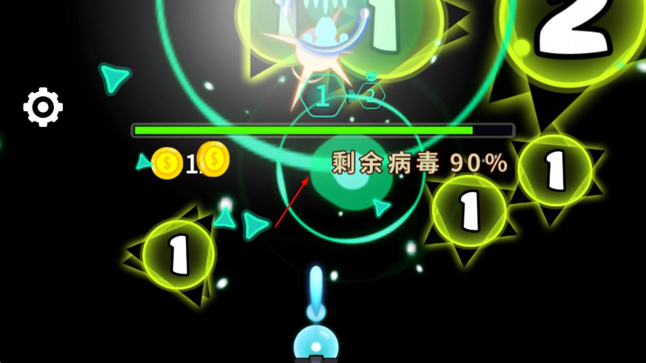 2、在闖關過程中,病毒磚塊會不斷移動或分裂,需及時調整瞄準方向,擊碎所有病毒可獲得金幣,用于升級武器性能。