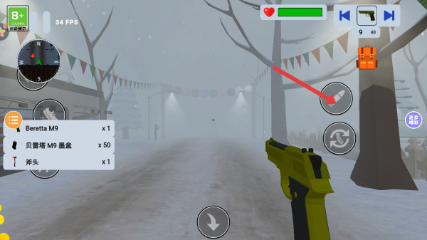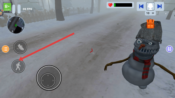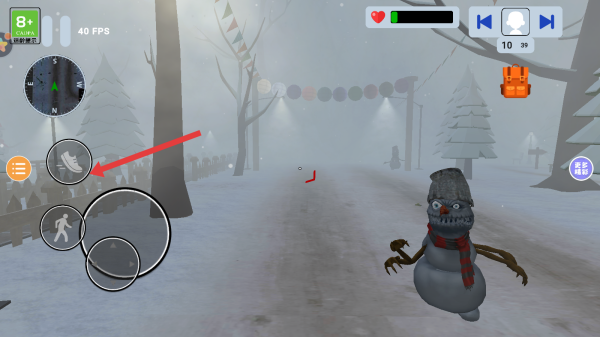 1、一開(kāi)局先看左側(cè)背包,確認(rèn)武器如手槍、斧頭,遇到雪人優(yōu)先用槍射擊右側(cè)開(kāi)火鍵,觀察敵人位置。