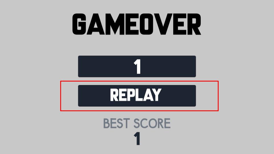 1、游戲出現(xiàn)GAMEOVER界面時(shí),點(diǎn)擊REPLAY按鈕,重新開啟方塊冒險(xiǎn)挑戰(zhàn),再次嘗試突破關(guān)卡。