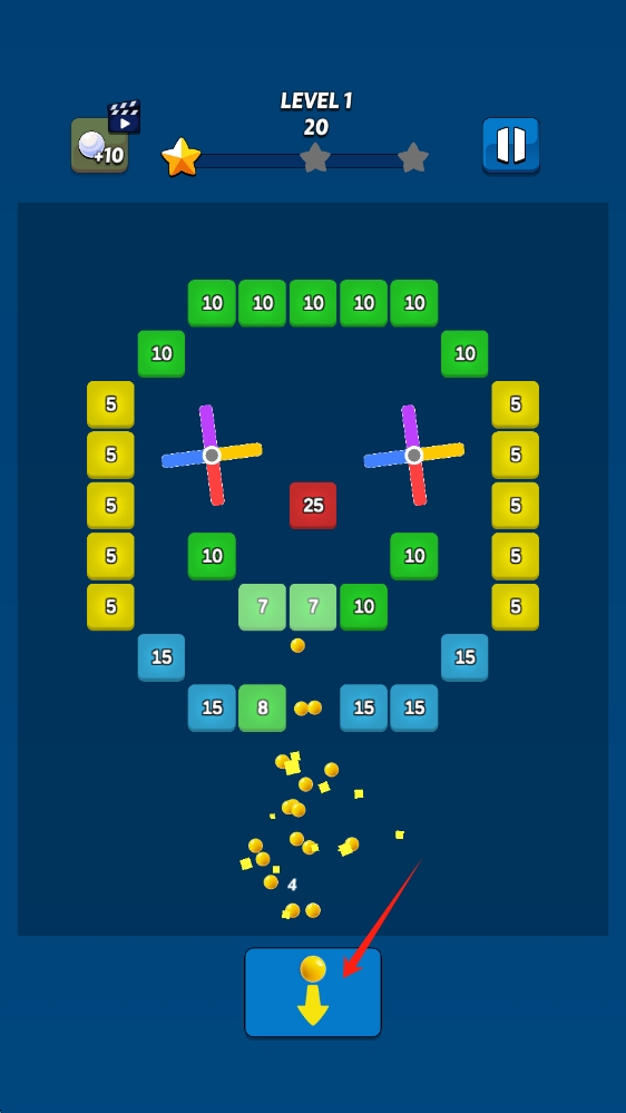 1、游戲開始時(shí),點(diǎn)擊發(fā)射按鈕,發(fā)射彈球撞擊數(shù)字方塊,點(diǎn)擊按鈕射擊數(shù)字方塊。