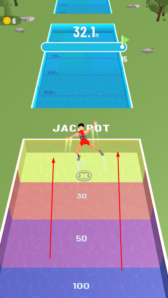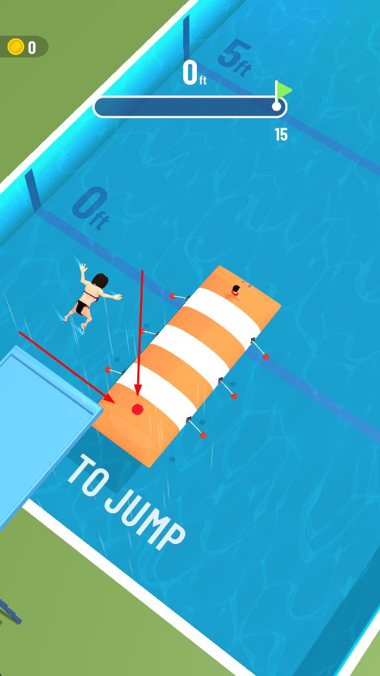 1、高臺(tái)跳躍瞄準(zhǔn)目標(biāo):玩家站在不同高度的高臺(tái)上,觀察目標(biāo)地點(diǎn)的位置如水池、氣墊等,通過指尖操作控制跳躍時(shí)機(jī),從高臺(tái)躍下后調(diào)整空中姿態(tài),確保準(zhǔn)確落入指定區(qū)域。