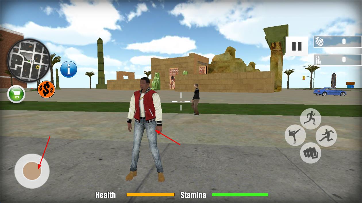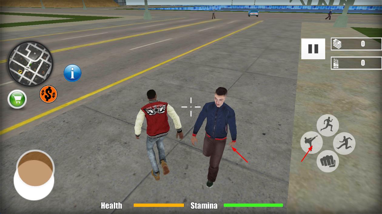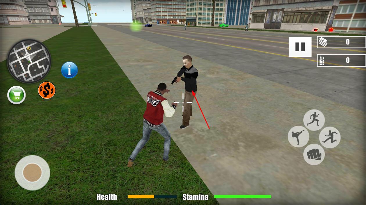 1、進(jìn)入游戲后,在初始街區(qū)熟悉操作,通過(guò)虛擬搖桿移動(dòng)角色,點(diǎn)擊武器圖標(biāo)切換裝備,嘗試首次搶劫商店獲取啟動(dòng)資金。