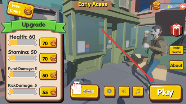1、在游戲初始界面中,依靠箭頭的指引點(diǎn)擊黃色Play按鈕,進(jìn)入關(guān)卡選擇頁面開啟格斗冒險(xiǎn)之旅。