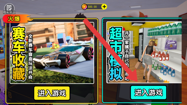 2、這是模式選擇界面,有賽車收藏和超市模擬兩種模式,分別對(duì)應(yīng)不同玩法,點(diǎn)擊進(jìn)入游戲可開(kāi)啟對(duì)應(yīng)模式體驗(yàn)。