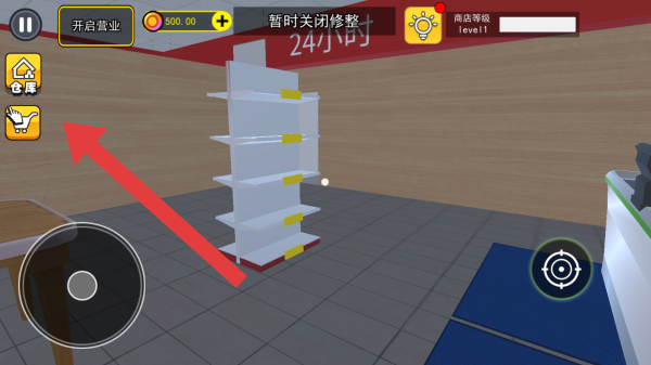 3、這是超市模擬模式的畫(huà)面,紅色箭頭所指圖標(biāo)是進(jìn)入倉(cāng)庫(kù)的按鈕,可管理超市運(yùn)營(yíng),包括開(kāi)啟營(yíng)業(yè)、店鋪修整等操作。