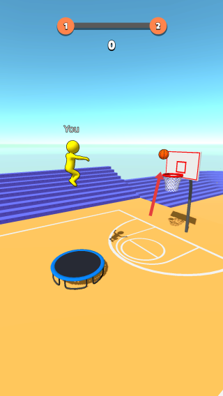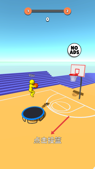 1、在籃球游戲中,操控黃色角色跳上蹦床,點(diǎn)擊屏幕投籃,瞄準(zhǔn)籃筐,嘗試得分。