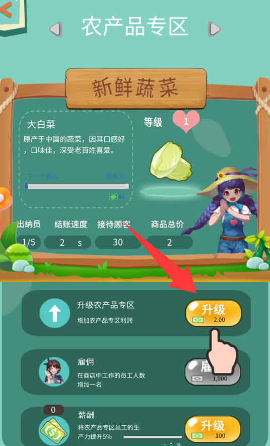 3、點擊紅色箭頭的升級,升級會增加利潤。